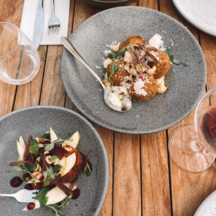 Left to right; Bespoke Kitchen Interior, Akarua entryway, Akarua arancini balls and halloumi